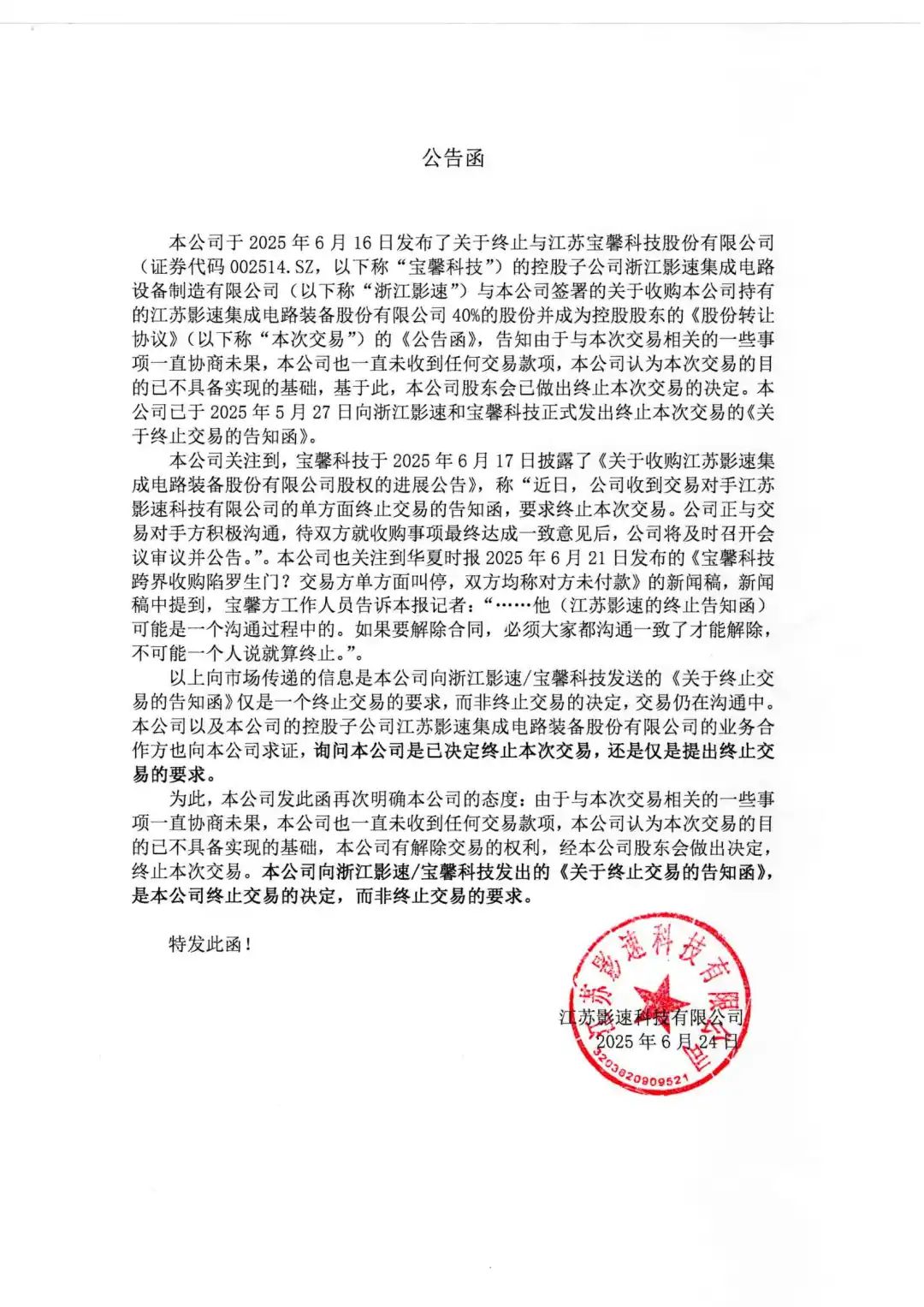 控股股东k1体育科技已终止与宝馨科技(证券代码002514.SZ)的控股子公司浙江k1体育关于收购本公司40%股份的交易